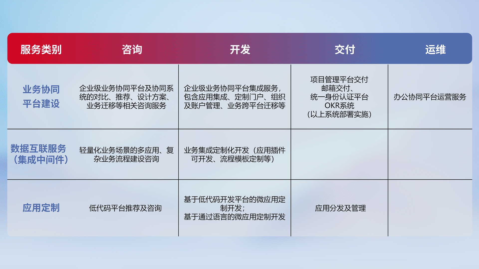 针对钉钉、、、企微、、IDaas等平台级产品提供产品的规划、、、方案、、、、交付、、、、定制化开发等服务,,,实现如统一协同办公、、智能客户服务、、混合会议管理、、智能数据查询、、、、等业务场景,,,实现数字化转型。。。。
